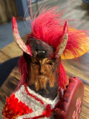 Красный шаман. Ручная работа Оберег. Кора кедра, мех оленя, натуральный рог и кожа. Украшен натуральным гранатом.