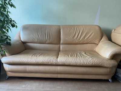 Кожаный диван + 2 кресла бежевого цвета. Состояние Б/У. Ширина: 198см; высота: 90см; есть спальное место.